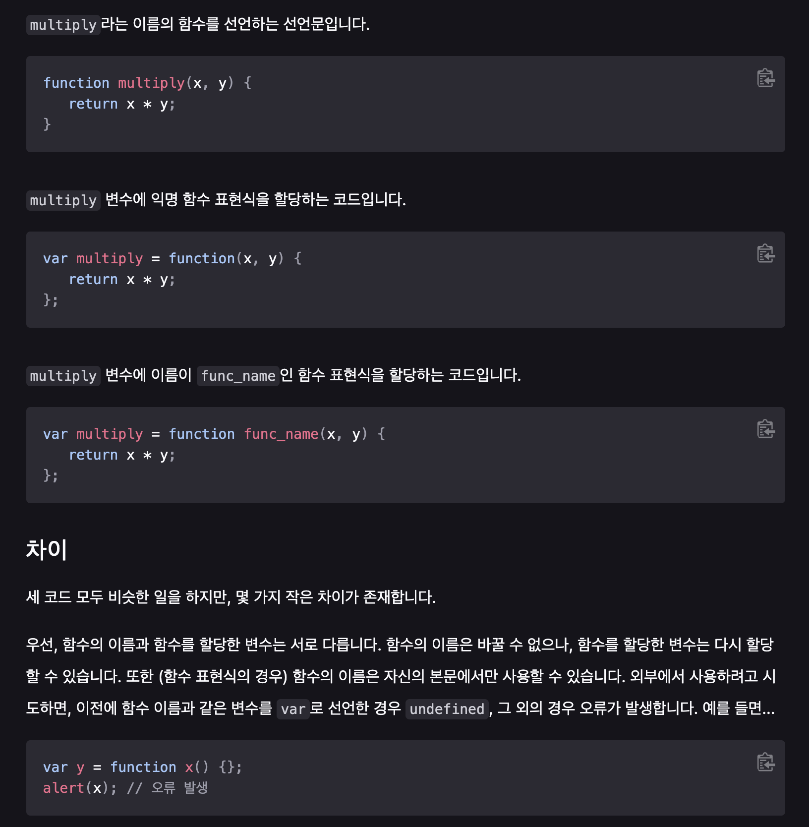 일반함수의 경우, 함수 전체가 전부 맨 위로 올라가므로 함수를 호출하는 위치에 상관없이 사용될 수 있다고 했다. 반면, 리터럴 방식으로 사용되는 익명 함수의 경우, 호이스팅 시 함수를 담는 변수의 선언부만 위로 올라가고, 익명 함수 자체는 변수가 호출되었을 때 실행되기 때문에, 선언부가 호출 위치보다 위에 있어야 한다.