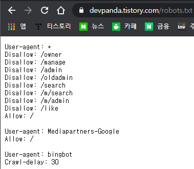 실제로 티스토리는 블로그 생성과 동시에 루트 디렉토리에 robots.txt 파일이 생성된다고 한다.
